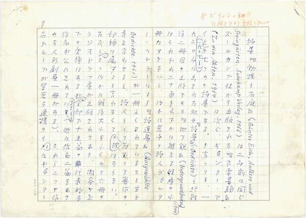 • 解説 『無題』 ペン書 400字詰原稿用紙3枚完 ギュンター・アイヒの詩集「動機と石庭」についての解説。署名は文末。(種別)解説 #八木書店近代自筆物/1.草稿類 #95号近代文学特輯 95309758 ※自筆物につきましては、毎月25日前後に新蒐品を追加しております。PDF形式で御覧になりたい方は https://company.books-yagi.co.jp/archives/news/10928 を参照ください。