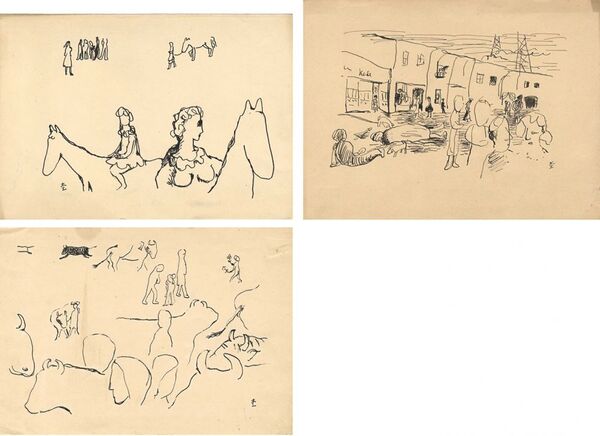 • 解説 紙 ペン17.5×25~19×25.8cm(シートサイズ)3枚少シミ 少ヤケ アタリ ※杢田たけを(兵庫生 1910-1987):洋画家。戦前は写実、戦後はコラージュ的な半立体作品を制作。