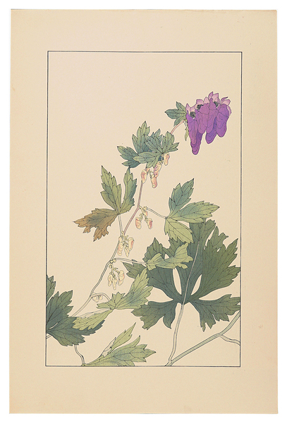 • 解説 木版 36.2x22.5cm(イメージサイズ)「鼠色一色の木版摺の投影写生図」「該当植物の写真図版付きの詳細な解説」3枚マージン少傷ミ・少折レ  「非水百花譜」には初版と再版が存在する。震災によって版木が消失したため、非水の手元にあった原画を元に新たに版木を彫りおこして制作、春陽堂刊。摺は田口喜久松。作品裏に「非水百花譜著者検章」が貼られている。初版と再版では紙やインクなど質感が多少の変化が見られ、モチーフも5点が異なる。本作は再版の為、「鼠色一色の木版摺の投影写生図」と「該当植物の写真図版付きの詳細な解説」のそれぞれが独立して3枚で1セットとなっている。