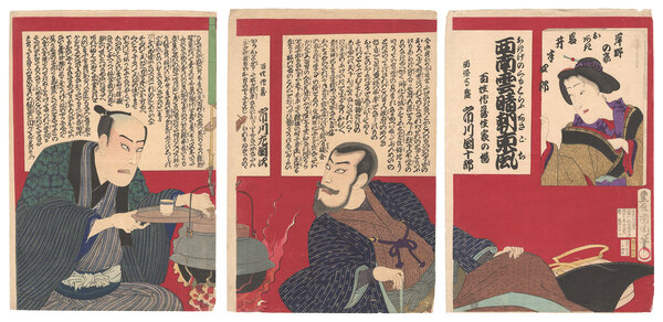 • 解説 Woodblock Print大判3枚続摺良 少ヤケ 少傷ミ 折レ シワ ピンホール 右図マージン1ヶ所少欠ケ 左から 百姓作蔵/市川左団次 西條高盛/市川団十郎 岸野の妾おあき/岩井半四郎