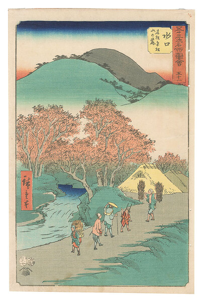 五十三次名所図会 五十一 水口 名松平松山の麓 Famous Sights of the Fifty-three Stations / No. 51, Minakuchi: Famous Pine Trees at the Foot of Mount Hiramatsu