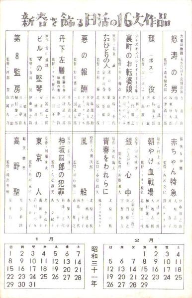 • 著者 裏面・新春を飾る日活の16大作品、昭和31年1・2月カレンダー