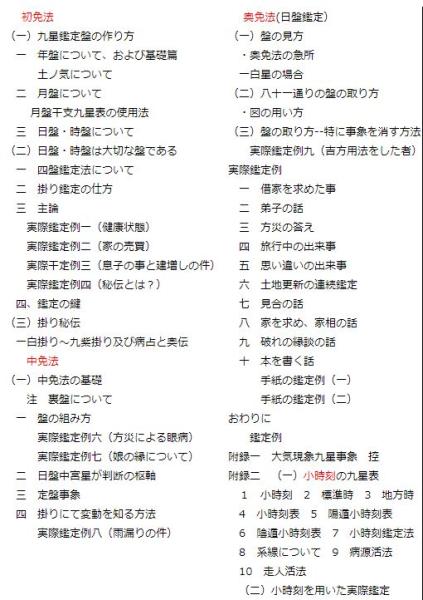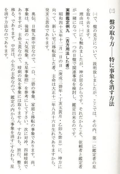 【目次】★初免法 ●(一) 九星鑑定盤の作り方 一、年盤についておよび基礎篇 土ノ気について ・二、月盤について 月盤干支九星表の使用法・三、日時について ●(二) 日盤・時盤は大切な盤である ・一、四盤鑑定法について 二、掛り鑑定の仕方 三、三主論 ・実際鑑定例一(健康状態) ・実際鑑定例二 (家の売買 ) ・実際干定例三 (息子の事と建増しの件) 実際鑑定例四 ( 秘伝とは?) 四、 鑑定の鍵 ●(三) 掛り秘伝 一白掛り~九紫掛り及び病占と奥伝 ★中免法 ・(一) 中免法の基礎 注 裏盤について・一、盤の組み方 ・実際鑑定例六 (方災による眼病) ・実際鑑定例七 (娘の縁について) ・二、日盤中宮星が判断の枢軸 三、定盤事象 四 、掛りにて変動を知る方法・ 実際鑑定例八(雨漏りの件) ★奥免法(日盤鑑定)・(一)盤の見方・奥免法の急所 一白星の場合 (二)八十一通りの盤の取り方 ・図の用い方 (三)盤の取り方--特に事象を消す方法 ・実際鑑定例九(吉方用法をした者)★実際鑑定例 一、借家を求めた事 二、弟子の話 三、 方災の答え 四、旅行中の出来事 五、思い違いの出来事 六、土地更新の連続鑑定 七、見合の話 八、家を求め、家相の話 九、破れの縁談の話 十、本を書く話 ・手紙の鑑定例(一)・手紙の鑑定例(二) おわりに★附録一 大気現象九星事象 控 ★附録二 (一)小時刻の九星表 1 小時刻 2 標準時 3 地方時 4 小時刻表 5 陽遁小時刻表 6 陰遁小時刻表 7 小時刻鑑定法 8 系線について 9 病源活法 10 走人活法 (二)小時刻を用いた実際鑑定