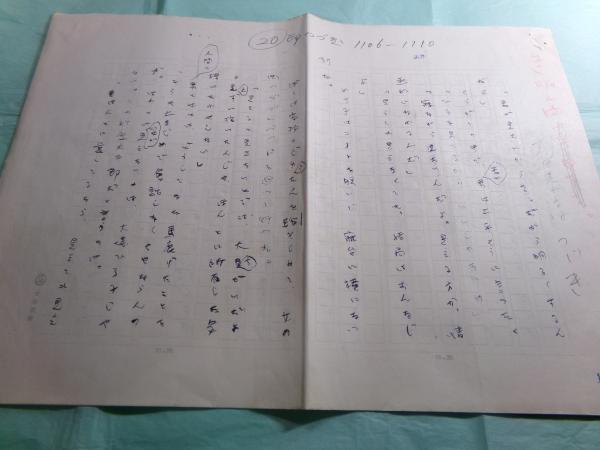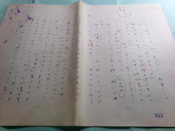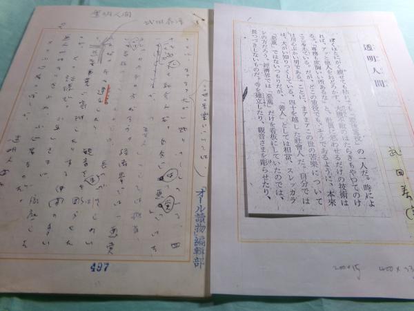 • 解説  武田泰淳(1912-1976)の肉筆。ペン書き。200字詰原稿用紙15枚(首無(巻頭の1枚、ノンブルNo.1)欠でノンブルNo.2-16)+400字詰の原稿用紙33枚(ノンブルNo.9-41)。欠けている首部分には当該掲載誌の切り抜きとそのコピーで補う。