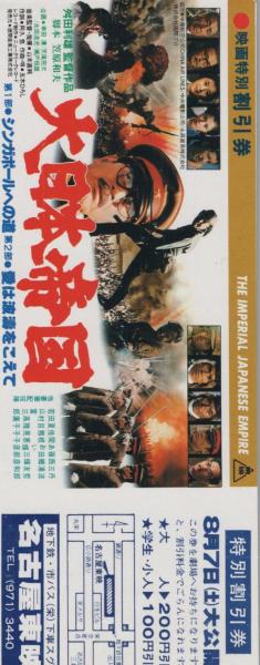 1007◆映画 割引券▲大日本帝国 舛田利雄 三浦友和 あおい輝彦 関根恵子 篠田三郎 夏目雅子 佳那晃子 愛知県名古屋東映
