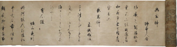 • 解説 「源安高賢の求めに応じて」 鳥の子料紙 黄土色地唐花幾何学文表紙 巻子装 30.5×452.5糎 紫檀軸 箱