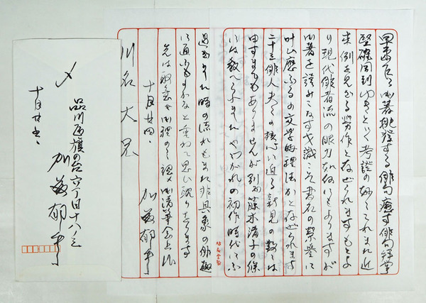 加藤郁乎書簡 川名大宛 毛筆書2枚 封付 『…二十三俳人夫々の核心に迫る新見の数々は…』