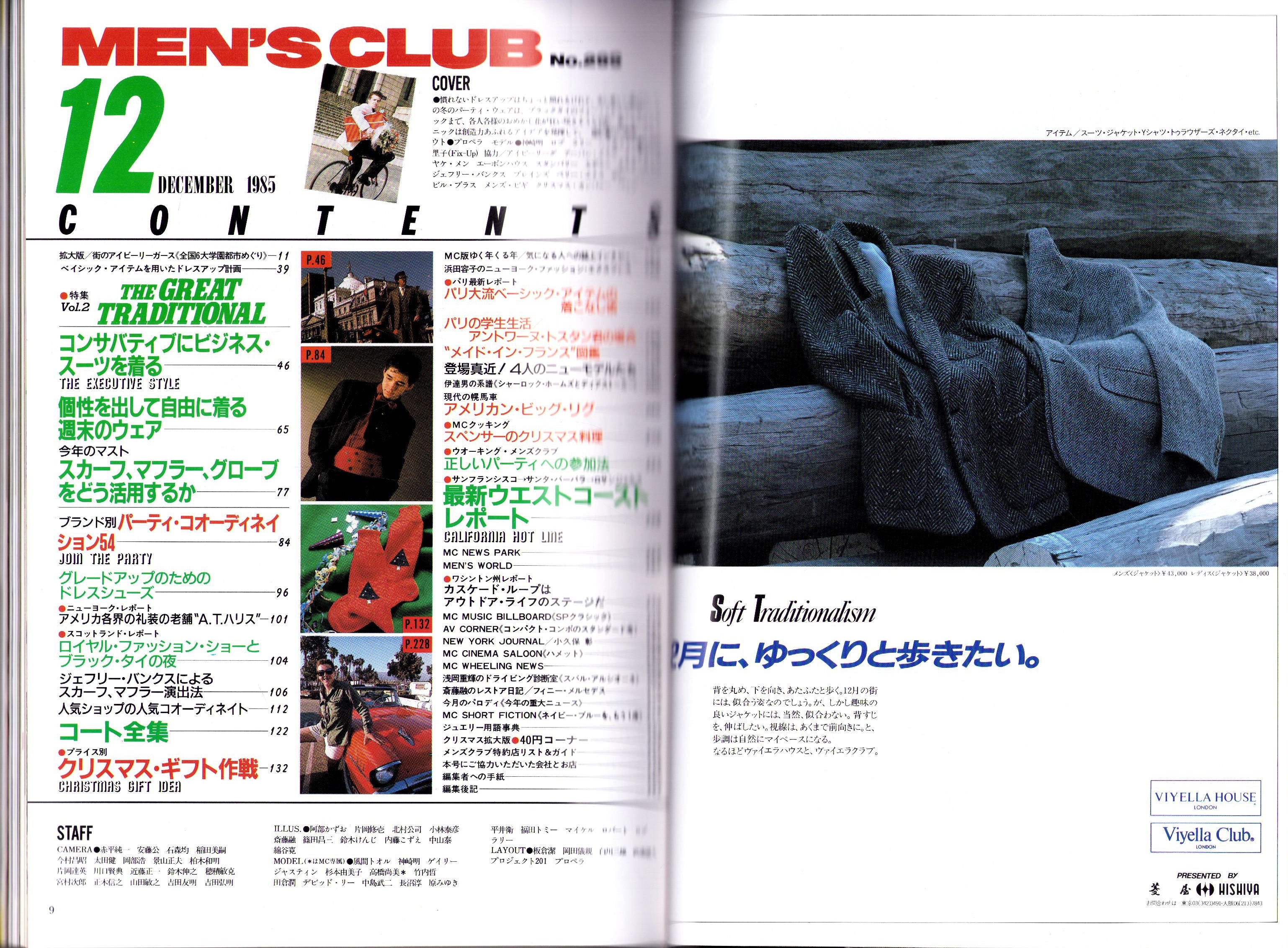 • 著者 〈拡大版/街のアイビーリーガース -全国6大学園都市めぐり-(札幌・仙台・国立・神戸・倉敷・博多)〉〈コンサバティブにビジネス・スーツを着る〉〈今年のマスト スカーフ、マフラー、グローブをどう活用するか〉〈ブランド別パーティ・コオーディネイション54〉〈コート全集〉〈プライス別クリスマス・ギフト作戦〉〈パリ大流ベーシック・アイテムの着こなし術〉〈“メイド・イン・フランス”図鑑〉〈登場間近!4人のニューモデルたち(谷川竜太郎、藤井真澄、石野正行、山内直史)〉〈最新ウエストコーストレポート〉〈多岐川隆「MCショート・フィクション 不良少年物語(最終回)」〉、浜田容子