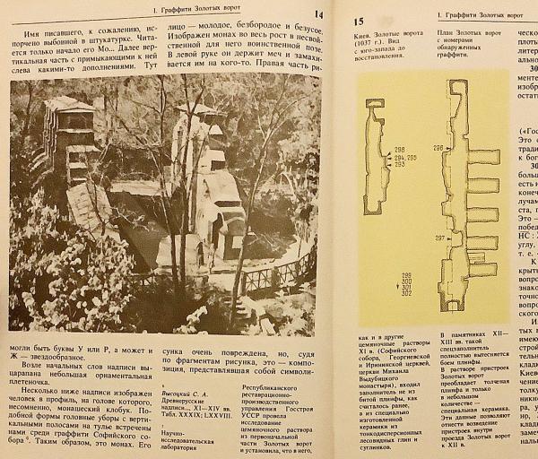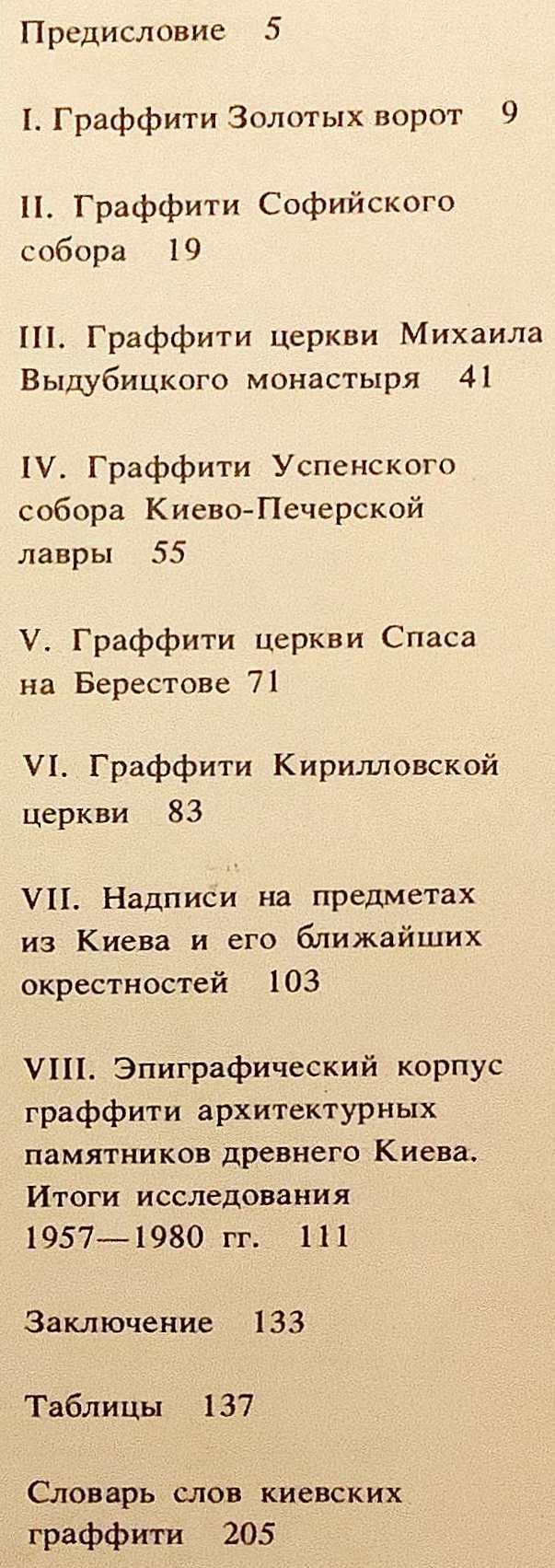 著者が1957年にキエフの聖ソフィア大聖堂で開始し、その後約25年にわたり黄金の門、ヴィドゥビツキー修道院ミハイル教会、キリル教会、キエフ・ペチェールシク大修道院などで進めてきた調査を総括した研究で、古代キエフの建築遺構に残る グラフィティ (壁への落書き銘文) を体系的に集成した碑文学研究。