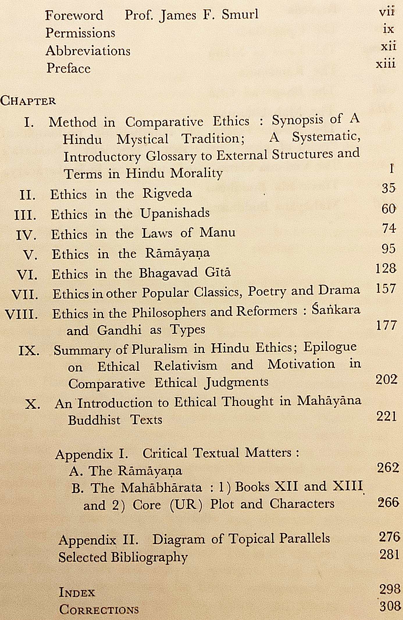 リグ・ヴェーダ、ウパニシャッド、マヌ法典、ラーマーヤナ、バガヴァッド・ギーターなどインド古典文献に見られる倫理観を分析し、さらにシャンカラやガンディーといった思想家の倫理思想にも触れながら、ヒンドゥー倫理の多元的構造を考察。