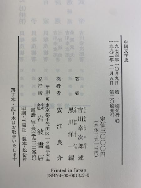中国文学史 岩波書店 吉川幸次郎:述 黒川洋一:編