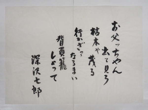 深沢七郎書まくり 『お父ッちゃん出て見ろ 枯木や茂る 行かざァなるまい 背負籠しょって』 毛筆書 257×363ミリ