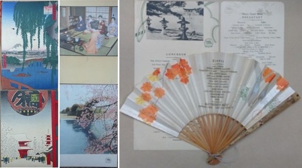 • 解説 表紙木版(見開き4頁、約19×13.5㎝) DINNER 11種 表紙彩色(見開き4頁、21.3×15㎝)/LUNCHEON 9種 1枚もの(26.5×15㎝・21×18.2㎝)/LUNCHEON 5種・DINNER 1種 1枚もの(17.5×11.4㎝)/BREAKFAST 10種 扇子に彩色(拡げると約19×34㎝)/DINNER 1種 合計37種 ※1枚ものLUNCHEON 1枚に埃点シミのものあり、ほか概ね良好