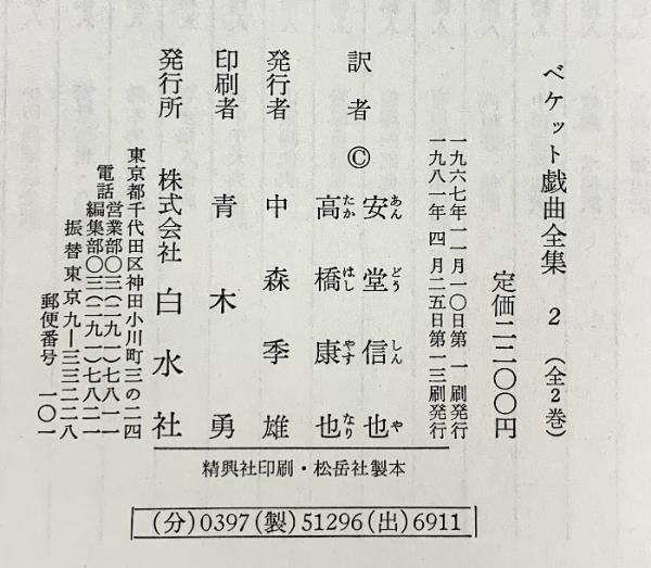 ベケット戯曲全集〈第2〉白水社 安堂信也・高橋康也:共訳