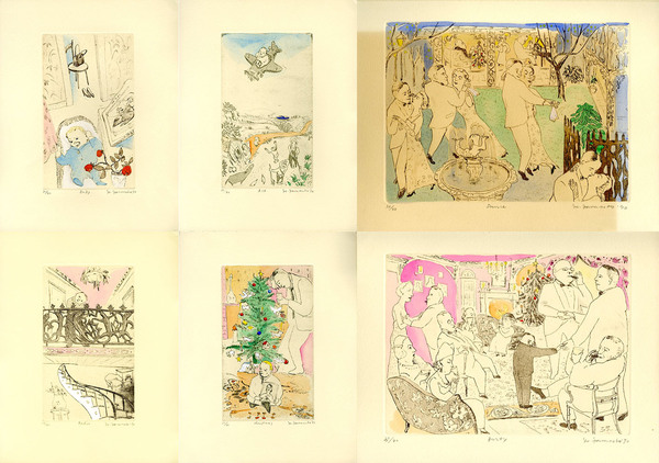 • 解説 ガレリア・グラフィカ オリジナル・手彩色エッチング(各サイン・エディション)全5葉揃(1. Baby 2. Air 3. Radio 4. Chrismas 5. Party 6. Dance) ※5. Party余白に1ヶ所少シミ 6. Danceヤケ イメージサイズ24×18 シートサイズ30×23 限40 奥付鉛筆サイン 帙 当版画集は、トルーマン・カポティ著・村上春樹訳・山本容子挿画の『あるクリスマス』(文藝春秋刊)のための銅版画より選んで制作された。