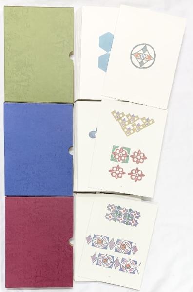 • 解説 (通函箱(外)・内箱)付。(外箱にスレ、ヨレ、ヤケ、シミ、傷み、剥がし跡、内箱にスレ、ヤケ、シミ、)。芋版(1~118枚)・(附/賀状+色紙/33枚)全151枚。(附/色紙絵1枚付)。