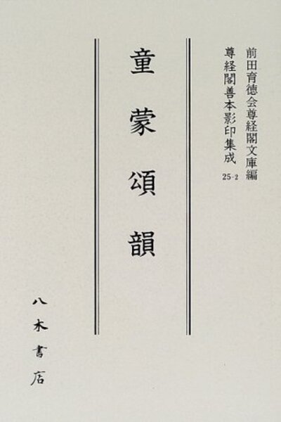• 解説 温故知新書〔室町末期写 2巻〕室町時代の辞書の一。2巻3冊。著者は大伴広公。文明16年成立。50音順配列の国語辞書としては最古のもので、尊経閣文庫所蔵本はその唯一の伝本。50音の部類を梵字で表記し、各部をそれぞれ乾坤・時候等12門に分け、掲出した語句の最初の音によって各部を配列する。収録語数は約1万3000。童蒙頌韻〔弘治2年写 2巻1冊〕三善為康撰。天仁2年成立。初学者の漢詩文作成にあたって韻字を覚える為に平声の韻字を上平・下平とも各16の韻に分類、4字句づつ諳んじるようにまとめた。
