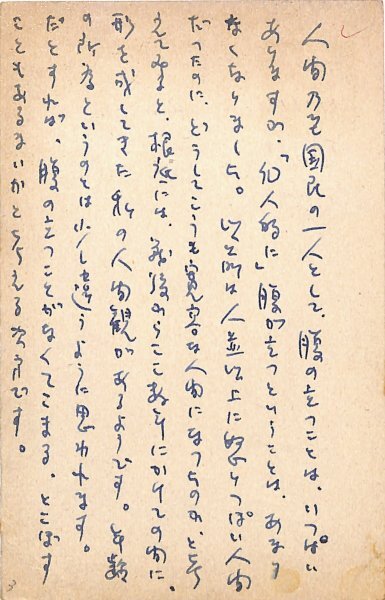 • 解説 北村卓三宛 ペン書 9行 昭40・3・11(消印) 返信葉書 アンケートの返信。「人間乃至国民の一人として、腹の立つことは、いつぱいありますが、『個人的に』腹が立つということは、あまりなくなりました」。(発信地)都下狛江町(受信地)三友社 #八木書店近代自筆物/3.葉書類 #95号近代文学特輯 95904208 ※自筆物につきましては、毎月25日前後に新蒐品を追加しております。PDF形式で御覧になりたい方は https://company.books-yagi.co.jp/archives/news/10928 を参照ください。