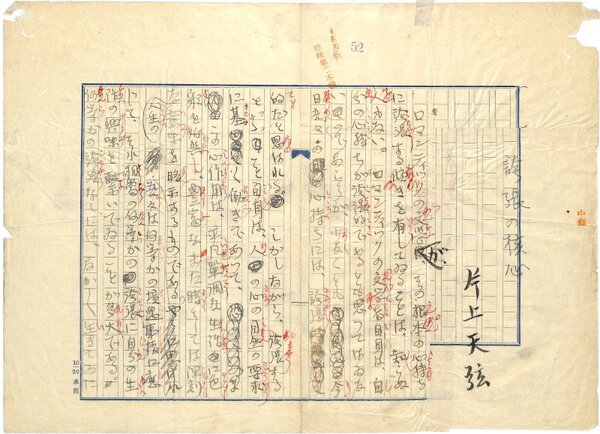 • 解説 『誇張の核心』冒頭 ペン書 400字詰原稿用紙6枚未完 「天弦」名義 切貼 傷み 文芸雑誌「趣味」掲載。(種別)資料 #八木書店近代自筆物/1.草稿類 #95号近代文学特輯 95210118 ※自筆物につきましては、毎月25日前後に新蒐品を追加しております。PDF形式で御覧になりたい方は https://company.books-yagi.co.jp/archives/news/10928 を参照ください。