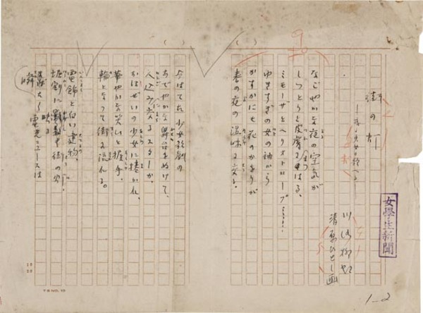 • 解説 『街の灯』或る少女の歌へる ペン書 400字詰原稿用紙2枚完 傷み しみ 「女学生新聞」掲載。(種別)近代詩 #八木書店近代自筆物/1.草稿類 #95号近代文学特輯 95403095 ※自筆物につきましては、毎月25日前後に新蒐品を追加しております。PDF形式で御覧になりたい方は https://company.books-yagi.co.jp/archives/news/10928 を参照ください。