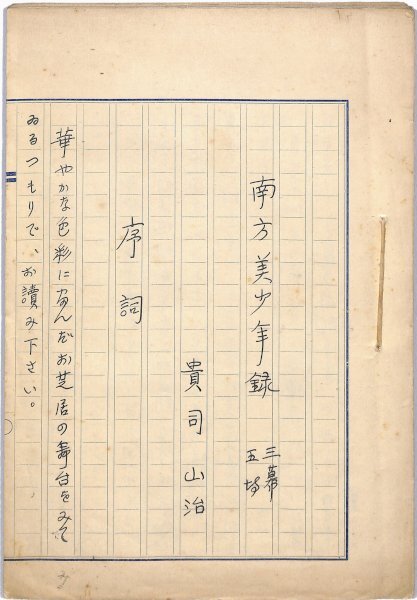 • 解説 『南方美少年録』 ペン書 400字詰原稿用紙63枚完 紙縒綴 ペリーの琉球訪問を題材とした戯曲。(種別)戯曲 #八木書店近代自筆物/1.草稿類 #95号近代文学特輯 95402349 ※自筆物につきましては、毎月25日前後に新蒐品を追加しております。PDF形式で御覧になりたい方は https://company.books-yagi.co.jp/archives/news/10928 を参照ください。