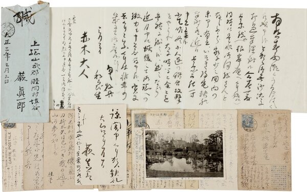 • 解説 赤木格堂宛 毛筆ペン書 大正期 書簡は切取がある。近況報告、贈答の礼、短歌のやりとりなど。他に蕨直治郎の葉書が4枚着く。(発信地)上総植谷(受信地)早稲田南町 #八木書店近代自筆物/2.書簡類 #95号近代文学特輯 95604855 ※自筆物につきましては、毎月25日前後に新蒐品を追加しております。PDF形式で御覧になりたい方は https://company.books-yagi.co.jp/archives/news/10928 を参照ください。