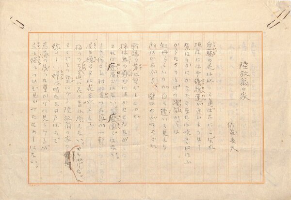 • 解説 『陸放翁の家』 ペン書 400字詰原稿用紙2枚完 「光」(3巻7号・昭和22年7月創作特集号・光文社)掲載。(種別)近代詩 #八木書店近代自筆物/1.草稿類 #95号近代文学特輯 95207339 ※自筆物につきましては、毎月25日前後に新蒐品を追加しております。PDF形式で御覧になりたい方は https://company.books-yagi.co.jp/archives/news/10928 を参照ください。