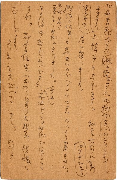 • 解説 小池吉昌宛 ペン書 9行 昭25・12・10付 お悔やみ状に近況報告を添える。「雑紙の仕事も危ないのでヘイコウです。ウッカリ出来ません。今は最も悪るい時代となりました」。(発信地)渋谷区初台(受信地)南多摩郡田町 #八木書店近代自筆物/3.葉書類 #95号近代文学特輯 95610170 ※自筆物につきましては、毎月25日前後に新蒐品を追加しております。PDF形式で御覧になりたい方は https://company.books-yagi.co.jp/archives/news/10928 を参照ください。