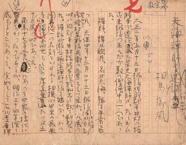 • 解説 『天海禅師の逸話』 ペン書 自家用箋1枚未完 裁断 貼合 18行 大正~昭和初期において、新聞・雑誌の入稿媒体として実際に利用された草稿。(種別)資料 #八木書店近代自筆物/1.草稿類 #95号近代文学特輯 95408954 ※自筆物につきましては、毎月25日前後に新蒐品を追加しております。PDF形式で御覧になりたい方は https://company.books-yagi.co.jp/archives/news/10928 を参照ください。