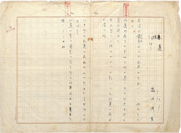 • 解説 『睡蓮』 毛筆 400字詰原稿用紙1枚完 傷み 「花浮び圓葉は浮ぶ水連の下水にごり雨ふりてゐつ」等5首。(種別)短歌 #八木書店近代自筆物/1.草稿類 #95号近代文学特輯 95012020 ※自筆物につきましては、毎月25日前後に新蒐品を追加しております。PDF形式で御覧になりたい方は https://company.books-yagi.co.jp/archives/news/10928 を参照ください。