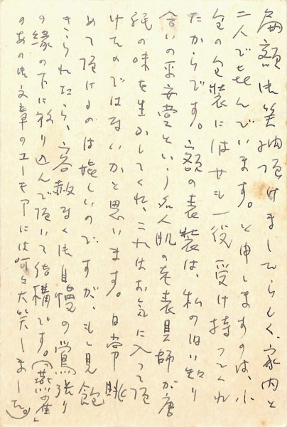 • 解説 今村秀太郎宛 ボールペン書 10行 昭47・12・5(消印) 書籍の注文。「御多用中御手数を相煩し恐縮ですが拙著「妻科の家」三冊御送付下され度願ひます 急ぎませんので速達でなくてもよろしうござます」。(発信地)日野市豊田(受信地)有楽町 #八木書店近代自筆物/3.葉書類 #95号近代文学特輯 95110408 ※自筆物につきましては、毎月25日前後に新蒐品を追加しております。PDF形式で御覧になりたい方は https://company.books-yagi.co.jp/archives/news/10928 を参照ください。