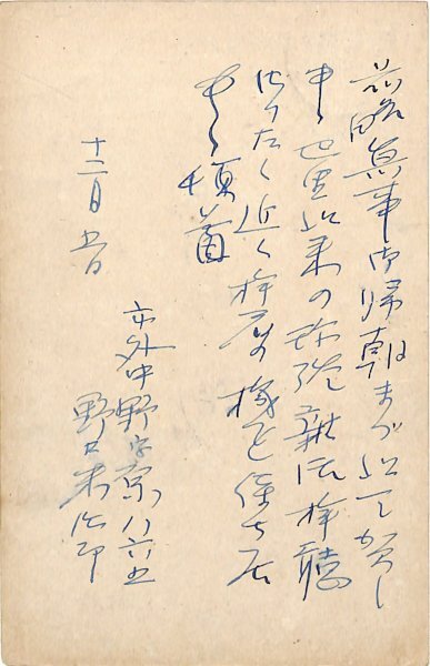 • 解説 生田葵宛 ペン書 6行 大4・12・5(消印) 帰朝した生田葵への挨拶状。「無事御帰朝まづ以て賀し申候 巴里以来の餘談雑伝拝聴仕りたく近く拝眉の機を待ち居申候」。(受信地)中渋谷 #八木書店近代自筆物/3.葉書類 #95号近代文学特輯 95201658 ※自筆物につきましては、毎月25日前後に新蒐品を追加しております。PDF形式で御覧になりたい方は https://company.books-yagi.co.jp/archives/news/10928 を参照ください。