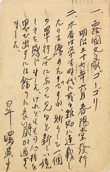 • 解説 國民新聞社學藝部宛 ペン書 9行 大14・10・5(消印) 処女出版について。「本書は学生時代に或る雑誌に連載したのを纏めたのですが、斯うして一個の單行本になつて見ると新しい嬉しさを感じました。」。(受信地)京橋區日吉町 #八木書店近代自筆物/3.葉書類 #95号近代文学特輯 95502128 ※自筆物につきましては、毎月25日前後に新蒐品を追加しております。PDF形式で御覧になりたい方は https://company.books-yagi.co.jp/archives/news/10928 を参照ください。
