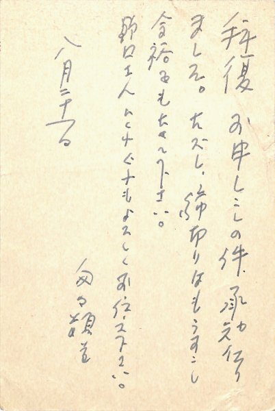 • 解説 「風景」編集部宛 ペン書 6行 昭49・8・21(消印) 中折 原稿依頼の返信。「お申しこしの件、承知仕りました。ただし、締切はもうすこし余裕をもたせて下さい」。(発信地)世田谷区喜多見(受信地)渋谷区鉢山 #八木書店近代自筆物/3.葉書類 #95号近代文学特輯 95506088 ※自筆物につきましては、毎月25日前後に新蒐品を追加しております。PDF形式で御覧になりたい方は https://company.books-yagi.co.jp/archives/news/10928 を参照ください。