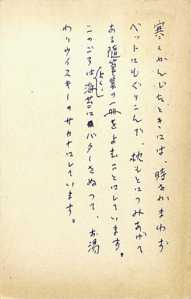 • 解説 北村卓三宛 ペン書 5行 昭39・12・11(消印) 返信葉書 アンケートの返信。「寒くかんじたときには、時をかまわずベットにもぐりこんで、枕もとにつみあげてある随筆集の一冊をよむことにしています」。(受信地)新宿区柏木 #八木書店近代自筆物/3.葉書類 #95号近代文学特輯 95606118 ※自筆物につきましては、毎月25日前後に新蒐品を追加しております。PDF形式で御覧になりたい方は https://company.books-yagi.co.jp/archives/news/10928 を参照ください。
