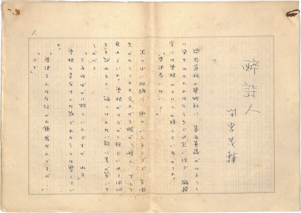 • 解説 『酔詩人』 ペン書 400字詰原稿用紙41枚完 葛西善蔵、広津和郎等が登場する文壇小説。(種別)小説 #八木書店近代自筆物/1.草稿類 #95号近代文学特輯 95010919 ※自筆物につきましては、毎月25日前後に新蒐品を追加しております。PDF形式で御覧になりたい方は https://company.books-yagi.co.jp/archives/news/10928 を参照ください。