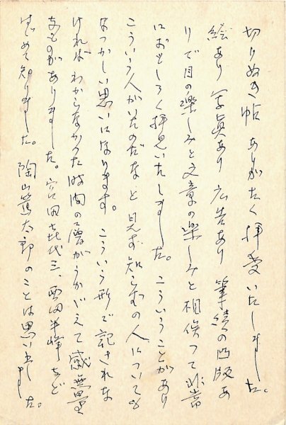 • 解説 竹内多三郎宛 ペン書 18行 昭55・5・20(消印) 表裏 「切りぬき帖」礼状。「絵あり写真あり広告あり筆蹟の凸版ありで目の楽しみと文章の楽しみと相俟って非常におもしろく拝見しました」。(発信地)八王子市横山町(受信地)川崎区大島上町 #八木書店近代自筆物/3.葉書類 #95号近代文学特輯 95106968 ※自筆物につきましては、毎月25日前後に新蒐品を追加しております。PDF形式で御覧になりたい方は https://company.books-yagi.co.jp/archives/news/10928 を参照ください。