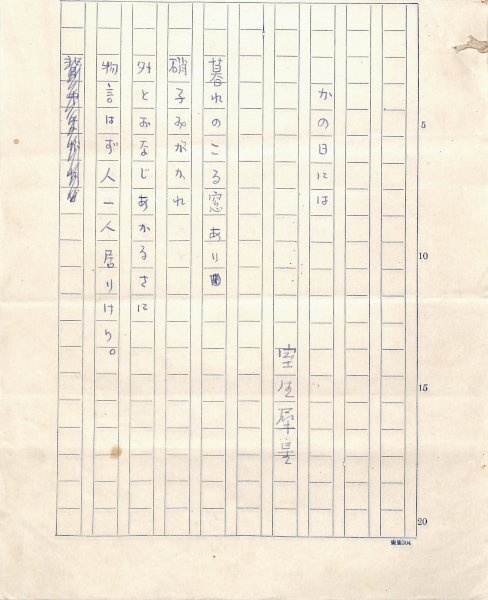 • 解説 『詩五篇』 ペン書 200字詰原稿用紙7枚完 「光」(3巻4号・昭和22年4月号・光文社)掲載。雑誌掲載は「かの日には」「あきもせぬに」「死」「人買ひに」「日もくれぬれど」の5篇だが、末尾に「炭火」「去年」の2篇がつく。原稿用紙の上端切取。末尾の2篇は原稿用紙を逆さにして書かれている。(種別)近代詩 #八木書店近代自筆物/1.草稿類 #95号近代文学特輯 95907929 ※自筆物につきましては、毎月25日前後に新蒐品を追加しております。PDF形式で御覧になりたい方は https://company.books-yagi.co.jp/archives/news/10928 を参照ください。