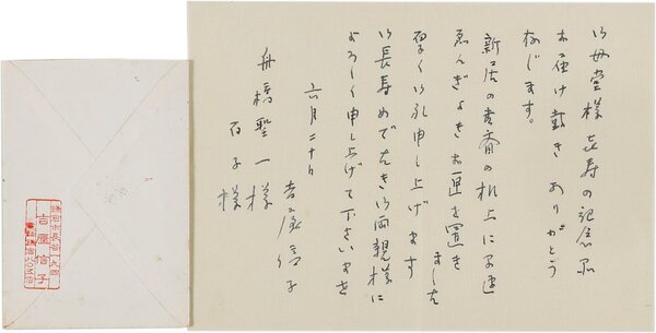 • 解説 舟橋聖一宛 ペン書 便箋12行 封筒付 昭37・6・21(消印) 記念品の礼状。「新居の書斎の机上に早速ゑんぎよきお匣を置きました 厚く御礼申し上げます」。(発信地)鎌倉市長谷(受信地)新宿区下落合 #八木書店近代自筆物/2.書簡類 #95号近代文学特輯 95007379 ※自筆物につきましては、毎月25日前後に新蒐品を追加しております。PDF形式で御覧になりたい方は https://company.books-yagi.co.jp/archives/news/10928 を参照ください。