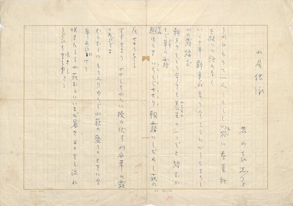 • 解説 『山居独詠』 ペン書 400字詰原稿用紙1枚完 「うれひもちて一人しくしく山の宿に春夏秋冬を経つつ飽かなく」等7首。昭和28年前後の作か。(種別)短歌 #八木書店近代自筆物/1.草稿類 #八木古書2026年2月新蒐 95512260 ※自筆物につきましては、毎月25日前後に新蒐品を追加しております。PDF形式で御覧になりたい方は https://company.books-yagi.co.jp/archives/news/10928 を参照ください。95号目録(R8.1)以後の追加は「#八木古書2026」で検索できます。