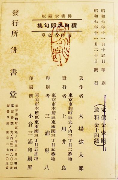 續白水郎句集 大場惣太郎著/小村雪岱装 初版箱痛み本体汚れシミ有り 俳書堂 昭和7年