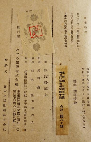 詩集 熊野濱歌 野長瀬正夫著 初版カバ みたみ出版 昭和19年