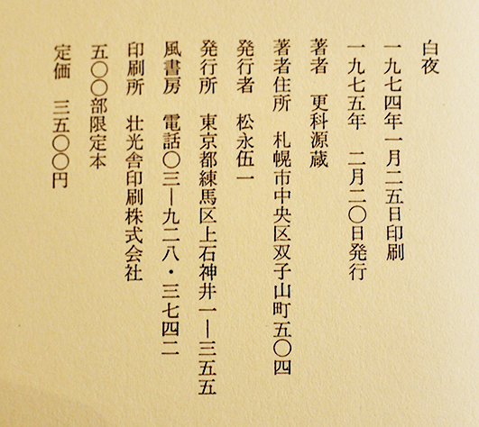 詩集 白夜 更科源蔵毛筆署名箋入 限定132/500部 A5判箱少痛み 風書房 1975年