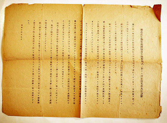 興亜青年勤労報国隊青年隊解除式ニ於ケル河原田文部大臣訓辞 B4判片面印刷 昭和14年