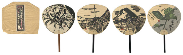 • 解説 木版長さ35×幅24cm(各団扇サイズ)袋 箱(壊レ有) 1組良好 4枚(1枚裏部分冠水シミ有)