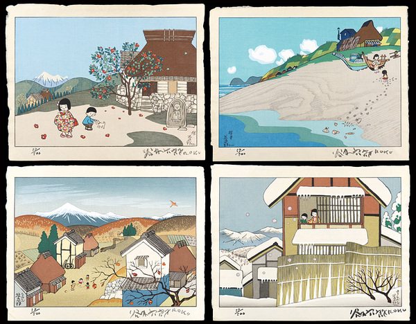 • 解説 木版28.5×40cm(各イメージサイズ)34.5×44cm(シートサイズ)ed.500共帙 (傷ミ)4枚Original Folderシミ 少ヤケ  版元:第一巧芸株式会社 全4枚:椿/桜貝/なわとび/冬のシャボン玉
