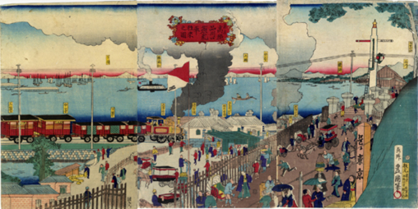 東京高輪品川口蒸気車往来之図