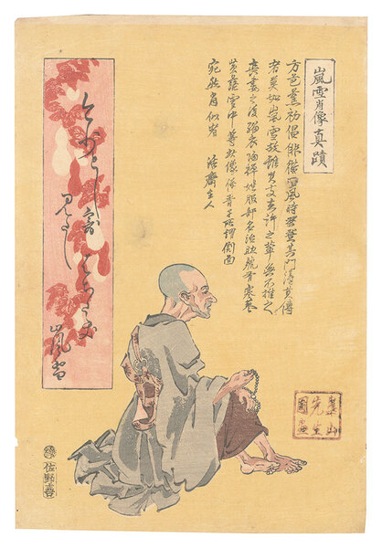 • 解説 Woodblock Print大判1枚摺良 トリミング 3ヶ所破レ補修 少虫穴 少ヤケ 少傷ミ シワ 佐野喜版  松尾芭蕉の門人である嵐雪の肖像錦絵。嵐雪の自筆短冊の模刻とともに、活斎(是網)による漢文体の略伝が添えられている。 「今少とし寄みたしはちたゝき 嵐雪」