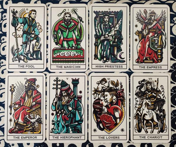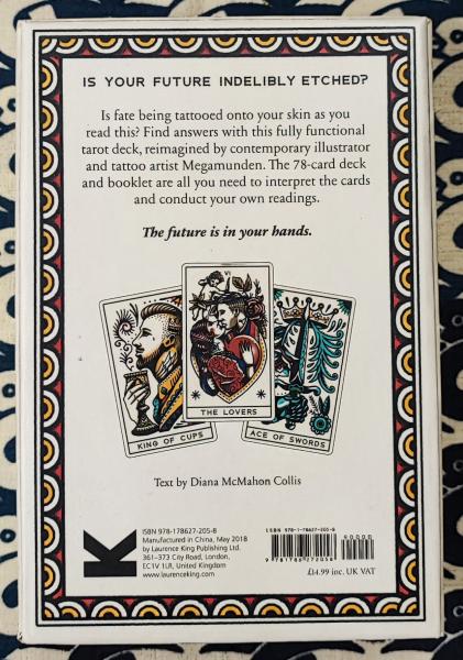 英国を拠点とするイラストレーターMEGAMUNDENによるデザイン。 広告、ファッション、大規模な壁画やタトゥーのデザインまで幅広く活躍するデザイナーです。 このデッキは美しく描かれたヴィンテージのタトゥーデザインが特徴的。 25ページにわたる専用の小冊子には、カード独自のスプレッドが掲載されています。 カードは、大アルカナと呼ばれる22枚と小アルカナと呼ばれる56枚の合計78枚組み。 大アルカナの上部に通し番号、下部に英語によるカード名称が書かれています。 8番が「Justice(正義)」、11番が「Strength(力)」となるマルセイユ版に準じた構成となっておりますが、絵柄は独自のデザインも含まれています。 裏柄は正位置と逆位置の区別のつかないタイプ。