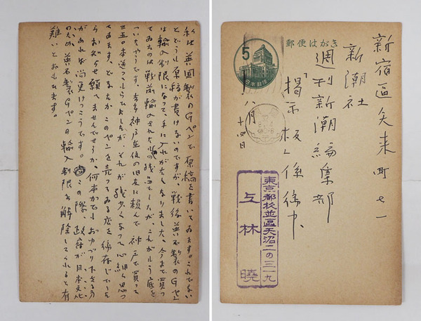 上林暁葉書 週刊新潮編集部「掲示板」宛 ペン書11行 名前はスタンプ